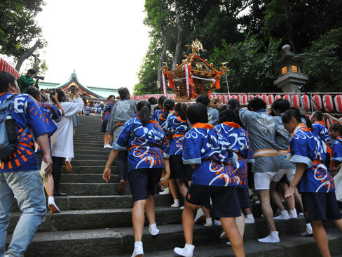 当日は気温が30℃を超す真夏日でしたが、みんな元気よく神輿を担ぎ、沿道からも大きな声援を頂きました。最後は日枝神社の52段の急こう配の階段(男坂)を登りきり、無事に神輿を奉納することができました。